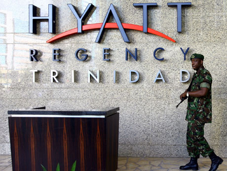 15日,在特立尼達(dá)和多巴哥首都西班牙港,安保人員在會(huì)場(chǎng)周圍巡邏。來(lái)自美洲國(guó)家組織的34個(gè)成員國(guó)首腦或代表將于17日至19日在西班牙港舉行第五屆美洲國(guó)家首腦會(huì)議。新華社發(fā)