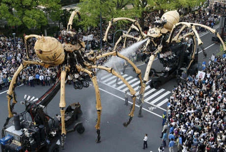 19日,一家法國(guó)公司制作的高12米、重37噸的巨型機(jī)械蜘蛛在日本港口城市橫濱街頭表演,慶祝橫濱開(kāi)港150周年。新華社/路透