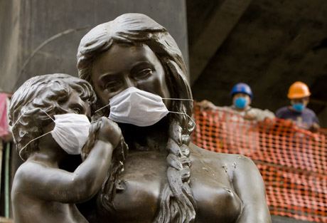 27日,為提醒人們嚴防豬流感疫情蔓延,墨西哥首都墨西哥城的一座雕塑被戴上口罩。新華社/法新 |