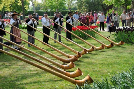 3日,游人在瑞士莫爾日舉辦的郁金香節(jié)上欣賞阿爾卑斯長號表演。