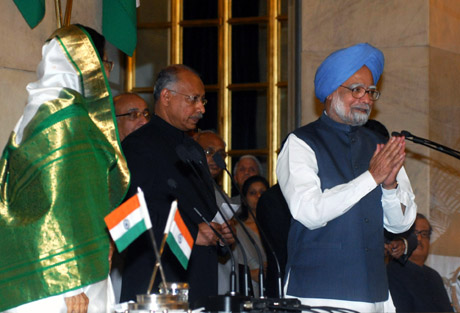 22日,在印度首都新德里,連任的印度總理曼莫漢·辛格(右一)宣誓就職。當(dāng)日,以曼莫漢·辛格總理為首的新一屆印度政府在印度總統(tǒng)府正式宣誓就職。新華社發(fā) | 以總理辛格為首的印度新政府22日宣誓就職后,其內(nèi)外政策走向成為印度國內(nèi)外輿論關(guān)注的焦點。當(dāng)?shù)孛襟w普遍認為,繼續(xù)拉動本國經(jīng)濟發(fā)展將是印度新政府各項工作的重中之重。 在印度新一屆政府中,前外交部長慕克吉出任財政部長,印度“硅谷”班加羅爾建造者之一、來自南方的前卡納塔克邦首席部長克里希納出任外交部長。慕克吉23日對媒體表示,保護印度經(jīng)濟免受國際經(jīng)濟衰退帶來的沖擊是新一屆政府的首要任務(wù),同時新政府將采取措施激活本國經(jīng)濟,保持經(jīng)濟增長。克里希納在會見記者時表示,印度外交是為經(jīng)濟發(fā)展服務(wù)的,印度政府的目標是在今后相當(dāng)長的時間內(nèi)保持經(jīng)濟增長,做到這一點需要和平安寧的周邊環(huán)境和有利的國際環(huán)境。