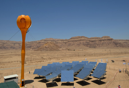 這是24日在以色列南部內(nèi)蓋夫沙漠地區(qū)的薩瑪爾集體農(nóng)莊拍攝的太陽能混合熱電站。當(dāng)日,以色列正式啟用這個世界上首個太陽能混合熱電站。該電站通過30個能跟蹤太陽的反射鏡將陽光反射后集中在高塔接收器上,接收器將空氣加熱成高溫高壓蒸汽來推動汽輪發(fā)電機(jī)發(fā)電。當(dāng)陽光不充足時,該電站可以用燃油、天然氣等其他能源發(fā)電。該電站發(fā)電功率為100千瓦,可以供給70戶家庭用電。