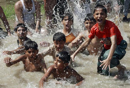 6月28日,在巴基斯坦拉合爾,孩子們在河里戲水納涼。據(jù)路透社報道,當(dāng)日拉合爾氣溫高達39攝氏度。