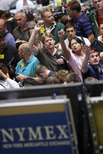 在美國紐約商品交易所,工作人員在原油期貨交易場忙碌。新華社/路透 |