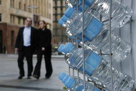 7月9日,2名市民走過澳大利亞悉尼一處賣瓶裝水的商鋪。針對使用瓶裝水對環(huán)境帶來的影響,澳大利亞新南威爾士州小鎮(zhèn)班達農(nóng)頒布全球首例禁止使用瓶裝水的法令。環(huán)保人士說,生產(chǎn)瓶裝水需使用大量塑料,而且在運送過程中會消耗大量能源。