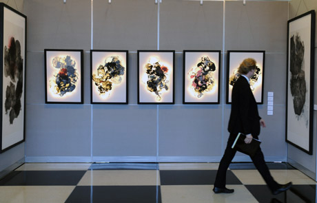 3日,在位于紐約的聯(lián)合國總部舉辦的“水墨之音”中國畫展上,一名聯(lián)合國工作人員從畫展作品前走過。當日,中國青年畫家周蘇音的水墨畫作品“水墨之音”畫展在這里開幕。