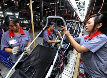 8月10日,福建晉江民營企業(yè)三力機車有限公司工人在生產出口產品割草機。在世界金融危機的背景下,擁有大小民營企業(yè)1萬多家的福建省晉江市民營經(jīng)濟仍然保持穩(wěn)步發(fā)展態(tài)勢。新華社記者張國俊攝 |