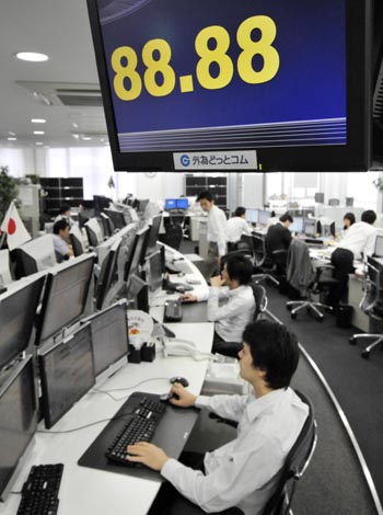 28日,一名交易員在東京外匯交易市場(chǎng)的外匯電子牌價(jià)下工作。(資料照片) | 28日東京外匯市場(chǎng),日元對(duì)美元匯率沖破90比1的關(guān)口,一度升至88.23比1的附近,創(chuàng)下自今年1月23日之后約8個(gè)月的盤中新高。在不到一個(gè)半月的時(shí)間里升值近10日元,從8月上半月時(shí)的97升至目前的水平。 為此,日本財(cái)務(wù)大臣藤井裕久29日上午對(duì)新聞界說,近日東京外匯市場(chǎng)上日元對(duì)美元升值速度“稍微有些快”,如果日元匯率發(fā)生“急劇變動(dòng)”,政府必須考慮采取對(duì)策。 藤井裕久認(rèn)為,日元匯率變動(dòng)的主要原因在于美國(guó)經(jīng)濟(jì)形勢(shì)。他表示,如果發(fā)生“異常事態(tài)”,將存在各種可能性。這一表態(tài)顯示日本政府在是否干預(yù)市場(chǎng)政策上有所調(diào)整。上周,藤井曾暗示政府不打算干預(yù)市場(chǎng)。 29日東京時(shí)間上午10時(shí),東京外匯市場(chǎng)上日元對(duì)美元匯率回落至90.2比1水平。市場(chǎng)人士指出,一些機(jī)構(gòu)投資者開始購(gòu)買美元,從而遏制了日元快速升值的勢(shì)頭。