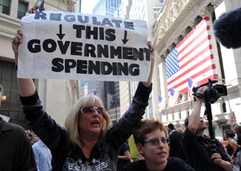 民眾聚集華爾街關注金融危機一周年。9月14日,在美國紐約華爾街的聯(lián)邦大廳外,一名抗議者手舉“華爾街首先應該進行改革”的標語。新華社記者 劉欣