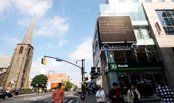 9月18日,在美國紐約,電子屏幕上顯示“慶祝中華人民共和國成立六十周年圖片展”。新華社記者 谷欣容