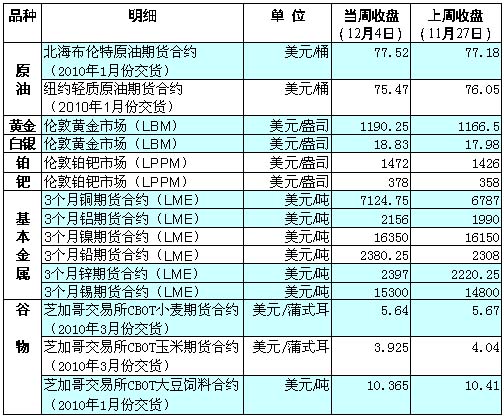 繼1日突破新“天花板”——每盎司1200美元大關(guān)后,倫敦市場金價(jià)3日再創(chuàng)新高,盤中升至1226.56美元。 在美元疲軟、通脹擔(dān)憂增加和各國央行普遍增加黃金儲(chǔ)備的背景下,國際金價(jià)近期節(jié)節(jié)攀升、連創(chuàng)新高。分析人士認(rèn)為,從目前看來,國際金價(jià)中期上行的動(dòng)力依然存在,短期回調(diào)不足以影響總體走強(qiáng)格局。高盛當(dāng)周發(fā)布報(bào)告,將其對(duì)未來12個(gè)月的金價(jià)預(yù)測值提高至每盎司1350美元,并預(yù)計(jì)明年黃金均價(jià)為1265美元! 〗饍r(jià)持續(xù)攀升拉動(dòng)其他貴金屬價(jià)格走高。當(dāng)周,倫敦市場白銀期貨價(jià)創(chuàng)下16個(gè)月來新高,達(dá)到每盎司19.46美元,鉑和鈀的期貨價(jià)分別創(chuàng)下15個(gè)月和16個(gè)月新高。 受到美國商業(yè)能源庫存高企、需求不振等因素的壓制,當(dāng)周國際油價(jià)在前兩個(gè)交易日小幅上漲后持續(xù)下跌。此外,根據(jù)美國勞工部公布的最新就業(yè)報(bào)告,11月份美國失業(yè)率意外下降至10%,顯示經(jīng)濟(jì)出現(xiàn)實(shí)質(zhì)性好轉(zhuǎn)。然而,由于投資者擔(dān)心經(jīng)濟(jì)的好轉(zhuǎn)會(huì)促使美聯(lián)儲(chǔ)提前加息,美元隨即受到追捧,從而拖累油價(jià)最終走低。因美國和中國制造業(yè)數(shù)據(jù)表現(xiàn)強(qiáng)勁,同時(shí)美元疲軟吸引了更多的投資資金進(jìn)入市場,倫敦市場銅期貨價(jià)當(dāng)周大幅上漲,2日盤中攀升至每噸7170美元,為去年9月以來最高。 其他基本金屬期貨價(jià)格也呈現(xiàn)不同程度漲幅,分析人士認(rèn)為,這主要是因?yàn)槿蚝暧^經(jīng)濟(jì)形勢基本面向好,對(duì)金屬的需求總體看漲。數(shù)據(jù)顯示,美國11月份失業(yè)人口只增加1.1萬,是本次危機(jī)開始以來表現(xiàn)最好的月份。另外,投資者相信經(jīng)濟(jì)合作與發(fā)展組織成員(OECD)對(duì)金屬的需求將會(huì)反彈,從而支撐金屬價(jià)格的上漲勢頭。 在基本面消息乏善可陳的情況下,外部市場主導(dǎo)了芝加哥市場農(nóng)產(chǎn)品期貨的價(jià)格走勢。當(dāng)周美元匯率的大幅上漲壓低了國際買家對(duì)美國農(nóng)產(chǎn)品的興趣,大豆、玉米和小麥的期貨價(jià)均較上周有所回落。