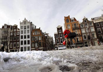 12月21日,在荷蘭首都阿姆斯特丹,一名郵遞員騎車行進(jìn)在冰雪覆蓋的街道上。歐洲大部分地區(qū)持續(xù)遭遇暴雪嚴(yán)寒天氣,截至21日已致死至少80人。新華社/法新 |