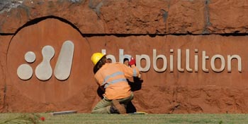 在澳大利亞的黑德蘭港,一名男子修理必和必拓公司的標(biāo)志。新華社/路透 |