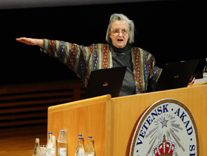 美國(guó)經(jīng)濟(jì)學(xué)家?jiàn)W利弗·威廉森和埃莉諾·奧斯特羅姆因在經(jīng)濟(jì)管理分析方面所作的貢獻(xiàn)而獲得2009年諾貝爾經(jīng)濟(jì)學(xué)獎(jiǎng)。(新華社發(fā)) |