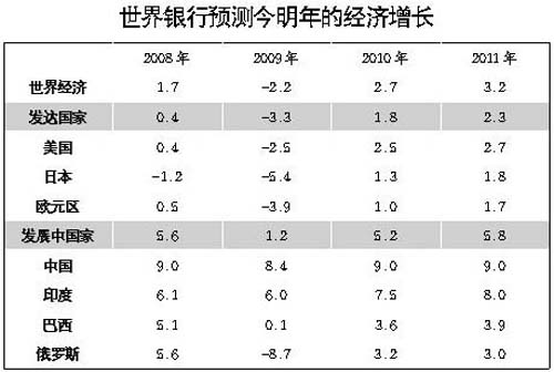 世界銀行報(bào)告認(rèn)為,隨著一系列經(jīng)濟(jì)刺激措施的實(shí)施,“危機(jī)最尖銳的階段已經(jīng)過(guò)去,世界經(jīng)濟(jì)正在復(fù)蘇進(jìn)程中”,此前的信貸市場(chǎng)凍結(jié)、資本流動(dòng)全面倒轉(zhuǎn)的極端情況已不復(fù)存在。 報(bào)告指出,從2009年3月份至今,各國(guó)股市已基本收復(fù)了一半的失地,經(jīng)濟(jì)復(fù)蘇首先在新興經(jīng)濟(jì)體開始,現(xiàn)在已全面擴(kuò)展至發(fā)達(dá)經(jīng)濟(jì)體。 按照世界銀行的這份最新報(bào)告,全球GDP在2009年下降2.2%,預(yù)計(jì)今年將增長(zhǎng)2.7%,2011年將增長(zhǎng)3.2%。發(fā)展中國(guó)家有望走向相對(duì)強(qiáng)勁復(fù)蘇,今年預(yù)計(jì)增長(zhǎng)5.2%,2011年預(yù)計(jì)增長(zhǎng)5.8%,均高于2009年的1.2%。 其中,中國(guó)經(jīng)濟(jì)2009年增長(zhǎng)8.4%,明后兩年則可望保持9%的高速增長(zhǎng)。這在世界各國(guó)中首屈一指,也高于印度今明兩年7.5%和8.0%的增幅。 發(fā)達(dá)國(guó)家在2009年GDP下降3.3%,復(fù)蘇走勢(shì)也相對(duì)緩慢,2010年和2011年的增長(zhǎng)預(yù)測(cè)分別為1.8%和2.3%。其中,美國(guó)經(jīng)濟(jì)2009年下降2.5%,今明兩年則可望分別增長(zhǎng)2.5%和2.7%。日本經(jīng)濟(jì)今年下滑5.4%,今明兩年增幅則只有1.3%和1.8%。 世界貿(mào)易量2009年大幅下降,降幅高達(dá)14.4%,但今年和2011年預(yù)計(jì)分別增長(zhǎng)4.3%和6.2%。 在油價(jià)方面,今年油價(jià)將維持在每桶76美元,其他大宗商品價(jià)格今明兩年也不大可能出現(xiàn)飚升,預(yù)計(jì)升幅在3%左右。