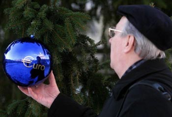 一名老人饒有興味地欣賞一只印有歐元符號的圣誕樹掛飾。新華社發(fā)(資料照片) |
