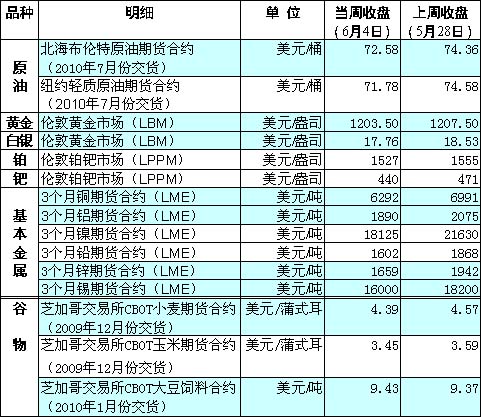 在歐元區(qū)主權(quán)債務(wù)危機持續(xù)影響下,歐元兌美元的比價當(dāng)周跌破1歐元兌1.20美元關(guān)口,為2006年3月24日以來低點,造成以美元計價的國際大宗商品價格普跌。不過,由于投資者對全球經(jīng)濟前景憂心忡忡,作為投資避風(fēng)港的黃金繼續(xù)受到市場追捧,盡管4日部分投資者獲利回吐,但國際金價仍在1200美元/盎司之上。 美國勞工部4日公布的非農(nóng)就業(yè)數(shù)據(jù)未及預(yù)期,市場普遍認為,高失業(yè)率將成為經(jīng)濟復(fù)蘇的重大障礙。受此影響,國際油價重跌。當(dāng)日收盤時,紐約商品交易所7月份交貨的輕質(zhì)原油期貨價格下跌3.10美元,收于每桶71.51美元。倫敦市場北海布倫特原油期貨價格下跌3.32美元,收于每桶72.09美元。 歐元走弱令投資者更加青睞美元和黃金,后者價格雖然時有小幅回調(diào),但仍處高位,分析師普遍認為,如果投資者情緒不發(fā)生轉(zhuǎn)變,未來金價將以1200美元/盎司為新起點而繼續(xù)上攻之勢。 由于主要消費國中國的制造業(yè)數(shù)據(jù)令市場擔(dān)心未來需求疲弱,導(dǎo)致倫敦金屬市場上基本金屬價格紛紛下挫。 市場中為數(shù)不多的亮點來自可可。由于供應(yīng)形勢緊張而需求預(yù)期大增,倫敦市場上可可期貨價格上揚,逼近33年來峰值。 歐元對美元比價跌破重要關(guān)口的消息還令國際農(nóng)產(chǎn)品價格承壓。此外,美國農(nóng)業(yè)部4日公布的農(nóng)產(chǎn)品周度出口銷售報告顯示,截至5月27日前的一周,美國私人出口商共出口銷售31.3萬噸玉米,遠遠低于70至100萬噸的市場預(yù)期。小麥和大豆的周度出口銷售量分別為24.11萬噸及14.81萬噸,也均不及市場預(yù)期。糟糕的出口數(shù)據(jù)成為芝加哥期貨交易所農(nóng)產(chǎn)品期貨價格暴跌的一大因素——當(dāng)日小麥期價觸及3年以來的新低,大豆期價創(chuàng)4周以來最大跌幅,玉米期價觸及8個月以來的低點。