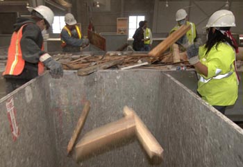 工人在位于美國加利福尼亞州舊金山市的廢物回收處理公司將混雜在建筑垃圾中的木料揀選出來。新華社記者 戚恒