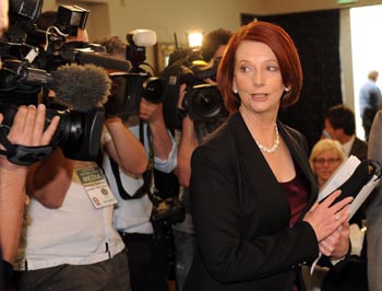 19日,在距澳大利亞聯(lián)邦大選只剩兩天之際,澳現(xiàn)任總理、工黨候選人茱莉亞·吉拉德在堪培拉國家媒體俱樂部召開新聞發(fā)布會,就其競選政策及施政綱領(lǐng)發(fā)表競選前最后一次演講。(法新社) |