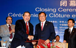 11月5日,第二屆中非企業(yè)家大會(huì)閉幕式暨簽約儀式在北京舉行,中國(guó)貿(mào)促會(huì)會(huì)長(zhǎng)萬(wàn)季飛(左三)和非洲工商會(huì)聯(lián)盟主席麥斯里(左二)簽署合作協(xié)議,正式宣告中國(guó)—非洲聯(lián)合工商會(huì)成立。