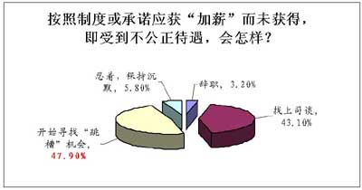 那么,在職場打拼的白領(lǐng)對加薪的態(tài)度是怎樣的呢?對于企業(yè)加薪規(guī)則是否滿意呢?日前,國內(nèi)權(quán)威的專業(yè)人才招聘網(wǎng)站之一中華英才網(wǎng)(ChinaHR.com)對此進行了調(diào)查。調(diào)查顯示,有接近一半的受訪者,比例為47.9%,在加薪上受到不公平待遇時,會“開始尋找跳槽機會”(如圖);而選擇正面與企業(yè)溝通的比例為43.1%,少于前者近五個百分點;有3.2%的受調(diào)者選擇了最極端的做法——辭職;能夠在這種情況下保持沉默的比例僅5.8%。(見圖)