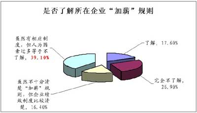 的確如人力資源專家擔心的那樣,受調(diào)查的職場白領(lǐng)對于所在企業(yè)的加薪規(guī)則了解的狀況不容樂觀;卮稹傲私狻钡氖茉L者的比例為17.6%,認為了解企業(yè)績效制度等同于了解加薪規(guī)則的比例為16.4%,兩者之和僅占總比例的1/3;而認為自己“完全不了解”的比例則為26.9%,尤其需要注意的是有高達39.1%的受調(diào)者對制度的執(zhí)行表達了遺憾,他們選擇了“雖然有相應(yīng)制度,但人為因素過多等于不了解”的態(tài)度。(見圖)