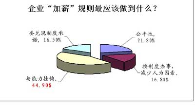 中華英才網(wǎng)人才研究中心專家指出,受調(diào)查的企業(yè)員工有近四成認為“人為因素過多”說明,企業(yè)在分配變動薪酬過程中往往由于分配薪酬的人存在著片面性、不公正性,而產(chǎn)生了許多矛盾,所以應(yīng)當加強薪酬變動部分分配的監(jiān)督機制,增強這類制度的透明度。他告訴記者:“一些優(yōu)秀國外公司在這方面的實踐結(jié)果表明:與沒有員工參加的績效付酬制度相比,讓員工參與報酬制度的設(shè)計與管理常令人滿意且能長期有效。員工對報酬制度設(shè)計與管理更多的參與,無疑有助于一個更適合員工的需要和更符合實際的報酬制度的形成。在參與制度設(shè)計的過程中,針對報酬政策及目的進行溝通、促進管理者與員工之間的相互信任,這樣能使帶有缺陷的薪資系統(tǒng)變得更加有效!蹦敲矗髽I(yè)“加薪”規(guī)則最應(yīng)該做到什么呢?如圖6所示,有44.9%認為首要的標準就是“與能力掛鉤”;其次有21.8%認為是公平性。(見圖)