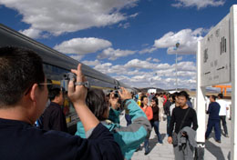 乘火車進(jìn)藏的旅客在那曲車站拍照留念。本報(bào)記者 唐召明 攝 |