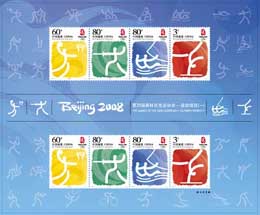 目前已經(jīng)有“會(huì)徽”與“吉祥物”小版張、“會(huì)徽與吉祥物”不干膠小版張、“奧運(yùn)項(xiàng)目”不干膠小版張等郵品上市!皶(huì)徽”與“吉祥物”小版張、“會(huì)徽與吉祥物”不干膠小版張2005年11月12日發(fā)行,自上市以來就在市場(chǎng)中扮演了無可比擬的角色。