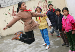 3月16日,惠民中心學校四年級一班的陳敏(左)正和伙伴們在新操場上跳皮筋。 為確保農(nóng)民工子女學校師生安全和健康,上海市教委近日出臺專門文件,以專項經(jīng)費支持形式,重點改善農(nóng)民工子女學校教室照明以及食堂、廁所等基本設(shè)施設(shè)備,進一步優(yōu)化校園環(huán)境。到今年8月31日之前,277所農(nóng)民工子女學校辦學條件將大大改善,滬上18萬農(nóng)民工子女將擁有更好的求學環(huán)境。 |