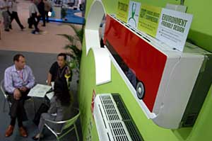 4月19日,客商在廣交會出口展館一家中國家電企業(yè)的綠色環(huán)保空調展臺洽談。在4月15日開幕的第101屆廣交會上,中國家電企業(yè)推出一批綠色節(jié)能環(huán)保型家電產品,積極應對歐盟頒布的第三代綠色壁壘——“耗能產品環(huán)保設計”指令。新華社記者