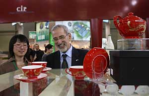 俄羅斯參觀者在觀看中國(guó)瓷器。本報(bào)記者 魯金博 攝