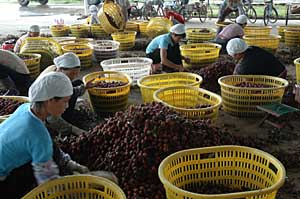 | 荔枝濃縮汁加工廠的工人正在分揀荔枝。荔枝深加工被認為是解決荔枝銷售的主要出路。梁思奇