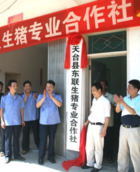 浙江天臺(tái)縣工商局工作人員為天臺(tái)縣東聯(lián)生豬專業(yè)合作社掛牌。(本報(bào)資料照片) | 記者在長(zhǎng)三角各地采訪農(nóng)民專業(yè)合作社時(shí),上海市農(nóng)委人士介紹的一個(gè)小細(xì)節(jié)讓人很受啟發(fā):過(guò)去農(nóng)民對(duì)外簽合同,類似“一打”、“一捆”之類的“模糊”用詞常常出現(xiàn),“弄得不好就起爭(zhēng)議”,F(xiàn)在合作社的合同越來(lái)越規(guī)范,政府提供的專業(yè)培訓(xùn)也說(shuō)得清楚,要選擇“噸”這樣的精確單位。 “噸”、“捆”之別可以看出長(zhǎng)三角農(nóng)民專業(yè)合作社“法人意識(shí)”正在不斷增強(qiáng)。特別是今年7月1日起《中華人民共和國(guó)農(nóng)民專業(yè)合作社法》正式實(shí)施,合作社的“法人地位”有法可依,成為國(guó)內(nèi)農(nóng)產(chǎn)品市場(chǎng)中的一大新興主體力量。