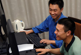 8月23日,在西安市一家賓館內(nèi),楊濤(左)和同伴一起為全國(guó)殘疾人技能競(jìng)賽做準(zhǔn)備。 31歲的楊濤目前在自己的家鄉(xiāng)陜西省吳起縣教育局擔(dān)任網(wǎng)絡(luò)管理員。10年前,聽(tīng)不清聲音的他被確診為神經(jīng)性耳聾,楊濤隨后開(kāi)始自學(xué)電腦,并通過(guò)網(wǎng)絡(luò)在西安市高新區(qū)找到一份工作。在高新區(qū)的工作激發(fā)了楊濤的學(xué)習(xí)與工作潛力,他漸漸成為公司的技術(shù)骨干,并經(jīng)常在網(wǎng)上幫助微軟解決技術(shù)難題。2004年起,楊濤連續(xù)四年被微軟總部授予“微軟最有價(jià)值專家”(簡(jiǎn)稱MVP)。 |