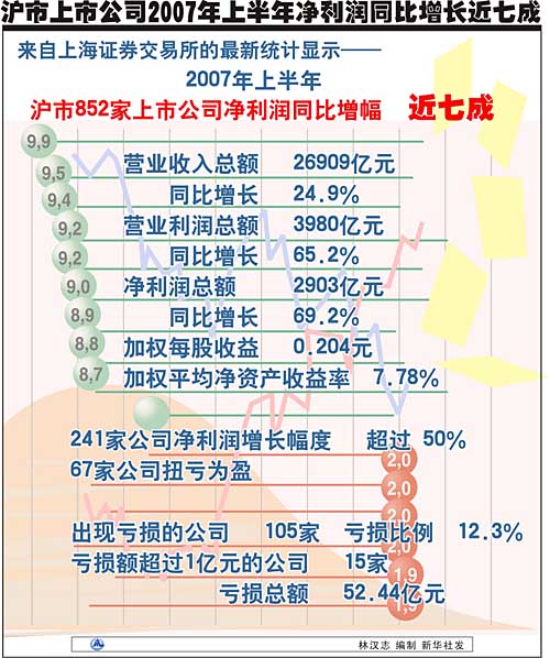 截至8月31日,除深市的S*ST蘭寶以外,兩市有1503家上市公司如期披露了2007年半年報。據(jù)統(tǒng)計,這些公司上半年共計實現(xiàn)主營業(yè)務(wù)收入35366億元,占今年上半年我國國內(nèi)生產(chǎn)總值的33.12%;共創(chuàng)造凈利潤3262億元,可比公司完成3232億元,同比增長69.87%。此外,1503家上市公司今年上半年平均每股收益0.1926元,平均每股凈資產(chǎn)2.487元,平均凈資產(chǎn)收益率7.745%。 上市公司業(yè)績的高增長一方面與宏觀經(jīng)濟(jì)景氣程度保持著較高一致,同時也與投資收益以及新會計準(zhǔn)則實施帶動一批公司獲得重組收益等有不小的關(guān)系。 今年半年報業(yè)績增長的一個突出特點是,投資收益增幅非常大,不少公司實現(xiàn)凈利潤大幅增長就是靠投資收益一塊。根據(jù)數(shù)據(jù)統(tǒng)計,不考慮去年下半年以來新上市的約59只股票,今年上半年1400多家上市公司實現(xiàn)投資收益比去年同期增長高達(dá)236.9%,而比去年全年的投資收益總和也大幅增長39%。 另有數(shù)據(jù)顯示,1500多家上市公司中有901家公司投資收益為正,僅174家公司投資收益為負(fù),合計實現(xiàn)的投資收益1163.8億元,占凈利潤總額的比例高達(dá)35.68%,相當(dāng)于上市公司1億元的凈利潤中有3500多萬元的利潤就來自投資收益。投資收益在半年報中“挑大梁”的角色顯而易見。 另外,業(yè)績高增長還有一個原因就是虧損額大幅下降。統(tǒng)計顯示,今年半年報虧損公司為208家,合計虧損79.32億元,對整個市場的業(yè)績吞噬率(虧損額/全部凈利潤)僅為2.44%;而去年同期可比的有252家公司虧損,虧損額133.55億元,吞噬率為7.07%。 在中國股市,虧損企業(yè)的吞噬率最高年份曾達(dá)到20%左右。從巨虧公司對市場吞噬20%,降至今天的不到2.5%,充分說明大股東掏空一類的非經(jīng)營性“失血”現(xiàn)象已經(jīng)得到很大改變。