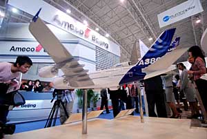 | 19日,參觀者在第十二屆北京國(guó)際航空展覽會(huì)上參觀空中客車A380模型。新華社記者 王建華