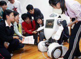 10月23日,由復旦大學師生自主研發(fā)的新一代智能機器人“復旦二號——復娃”正通過語音及自帶的視頻系統(tǒng)播放十七大現(xiàn)場視頻,吸引了同學們前來“聽講”。新華社記者:劉穎