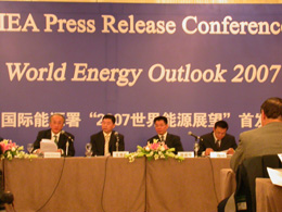 《世界能源展望2007》中國首發(fā)式現(xiàn)場(chǎng)。 | “中國有可能給世界帶來前所未有的能源機(jī)遇,參與全球治理已成為中國能源戰(zhàn)略的必然選擇!鼻迦A大學(xué)國情研究中心主任胡鞍鋼教授說,“中國和印度的崛起,不僅改變了世界經(jīng)濟(jì)和貿(mào)易的格局,也改變了世界能源格局,中國和印度所面臨的能源挑戰(zhàn)也就是全球的挑戰(zhàn)! 胡鞍鋼教授是在11月9日國際能源署(IEA)舉行的《世界能源展望2007》中國首發(fā)式上做上述表示的。