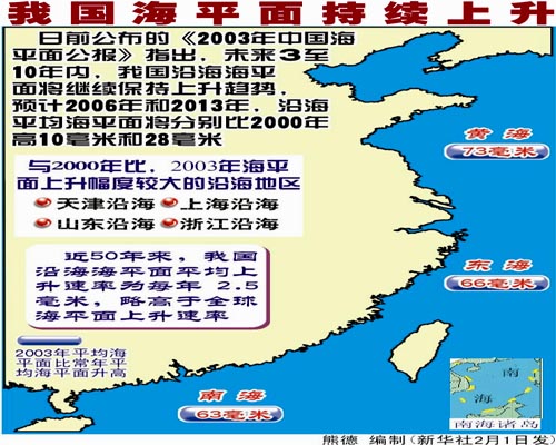 國家海洋局發(fā)展戰(zhàn)略研究所高級工程師鄭淑英告訴記者,近50年來,我國沿海海平面以每年2.5毫米的速率上升,高于全球海平面上升速率的40%。 “2006年,我國沿海海平面比常年平均海平面高71毫米,預(yù)計(jì)2016年,我國沿海海平面將比2006年上升31毫米!编嵤缬⒄f,海平面上升將直接引發(fā)風(fēng)暴潮災(zāi)發(fā)生的頻率增大,災(zāi)害強(qiáng)度加大,同時(shí)加重海水倒灌、海岸侵蝕等災(zāi)害影響,直接導(dǎo)致沿岸陸地被淹、海島面積縮小。