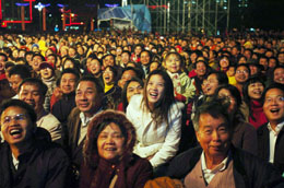 2008年1月1日,藝術(shù)家們的精彩表演讓觀看演出的當(dāng)?shù)厝罕婇_(kāi)懷大笑。 2008年1月1日,由中國(guó)文聯(lián)組織的宋祖英、姜昆、韋唯、湯燦等近百名藝術(shù)家到廣西開(kāi)展“送歡樂(lè)、下基層”活動(dòng),當(dāng)晚在廣西欽州市欽州港中山廣場(chǎng)為廣西人民奉獻(xiàn)上一臺(tái)精彩演出,受到當(dāng)?shù)厝罕姷臒崃覛g迎!八蜌g樂(lè)、下基層”是中國(guó)文聯(lián)為引導(dǎo)廣大文藝工作者深入基層、服務(wù)群眾,滿足基層群眾豐富“兩節(jié)”期間精神文化生活需要而打造的一個(gè)品牌項(xiàng)目。 |