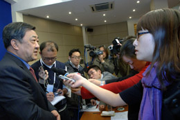2月14日,商務(wù)部部長助理黃海(左一)接受記者采訪。 新華社記者:何俊昌