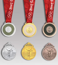 北京奧組委公布的2008年奧運(yùn)會(huì)金(中)、銀(左)、銅牌式樣(下排為獎(jiǎng)牌正面)。 |