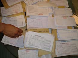 據(jù)一位知情人士透露,賣(mài)假發(fā)票者經(jīng)常在醫(yī)院門(mén)口轉(zhuǎn)悠。記者在上午11點(diǎn)左右到達(dá)某醫(yī)院門(mén)口后,看到醫(yī)院東門(mén)和北門(mén)共有十四五個(gè)賣(mài)假發(fā)票的,他們基本上是中年婦女,幾乎每個(gè)人都領(lǐng)著孩子,年齡小點(diǎn)的抱著,稍微大一點(diǎn)的、也就五六歲左右的則在周?chē)嫠,孩子們也隨著各自的“母親”,不斷地在東門(mén)和北門(mén)之間流動(dòng)。 “你們大約幾點(diǎn)出來(lái)?大冷天抱著孩子不受罪嗎?”記者問(wèn)一位中年婦女。 “一般早上九點(diǎn)多就過(guò)來(lái),傍晚天黑才回去。萬(wàn)一有檢查的,俺們抱著孩子他們也不會(huì)抓!彼S即笑了起來(lái)。 記者說(shuō)想要買(mǎi)發(fā)票,她馬上拉住記者的衣角小聲說(shuō),“買(mǎi)我的吧,多買(mǎi)點(diǎn)我給你便宜。100元的發(fā)票一張三塊錢(qián),你也知道醫(yī)院東門(mén)要賣(mài)五元呢! “你們賣(mài)這個(gè)的不是一起的嗎?”聽(tīng)記者這么一說(shuō),她當(dāng)即否定,表示都是自己賺自己的錢(qián)。不過(guò)記者同時(shí)發(fā)現(xiàn),在這些中年婦女中間,始終有一個(gè)中年男子來(lái)回走動(dòng),不時(shí)地照顧玩耍的孩子,一會(huì)兒又和中年婦女交談。 “現(xiàn)在是2008年了,奧運(yùn)馬上來(lái)了,查得嚴(yán)了,賣(mài)的人不如以前多了!币晃毁u(mài)假發(fā)票的中年婦女一邊說(shuō),一邊注視著來(lái)往的人群。