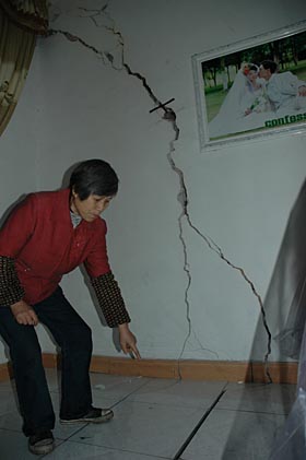 | 村民在嚴(yán)重沉陷的住房?jī)?nèi).住房嚴(yán)重開(kāi)裂。 | 采煤負(fù)效顯現(xiàn)
