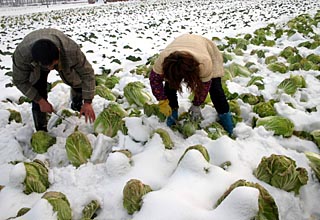| “蔬菜之鄉(xiāng)”湖北省嘉魚縣組織菜農(nóng)及時(shí)采摘蔬菜,向武漢、廣東等大城市配送,保證市民雪后的蔬菜供應(yīng)。新華社記者 余國(guó)慶