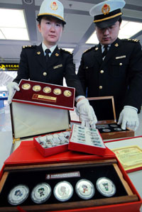 近日,沈陽海關(guān)在沈陽桃仙國際機(jī)場空港口岸連續(xù)查獲兩起涉嫌侵犯北京奧運(yùn)會奧林匹克知識產(chǎn)權(quán)案件,共查獲涉嫌侵權(quán)的鑰匙鏈120個(gè)、紀(jì)念幣22套和若干紀(jì)念郵票等物品。圖為海關(guān)工作人員在清理查獲的涉嫌侵犯北京奧運(yùn)會奧林匹克知識產(chǎn)權(quán)的物品。