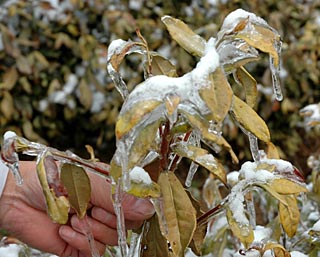 | 安徽大別山暴雪重災(zāi)區(qū)岳西縣,茶葉上覆有數(shù)厘米厚的冰層。新華社記者 程士華