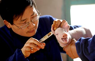 | 湖北京山縣寶源種豬場職工在給剛出生的仔豬打耳缺。通過耳缺,可以查出出售后每頭豬的來源、父母、出生重量以及繁殖性能等各種信息。新華社記者