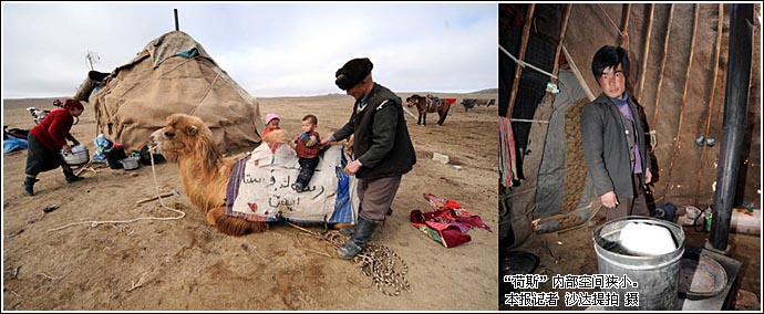 風(fēng)沙四起,哥哥留下的痕跡頃刻無影無蹤。說起當(dāng)年的那次迷路,別列提克至今后怕不已:風(fēng)沙與黑夜無邊無際,自己一個(gè)人在沙丘后面躲了7個(gè)小時(shí)、也哭了7個(gè)小時(shí)!耙皇歉绺缁貋碚,我肯定死了。” 大風(fēng)來的時(shí)候,羊們會順著風(fēng)走,只有用鞭子不斷敲打,才能讓它們穩(wěn)住陣腳。“風(fēng)沙天,羊走出去50米,你就休想再把它找回來”,別列提克說。 有一年在阿克達(dá)拉冬牧場,本村的達(dá)吾列提拜和他的羊群都被大風(fēng)吹走了。后來,人被救了回來,300只羊,一夜之間全沒了。 游牧中的女人最是辛苦。白天要洗衣做飯帶孩子,夜里要看管羊群。一般每兩個(gè)小時(shí)要走出氈房看一次,大聲吆喝驅(qū)趕野獸,一夜下來只能睡5個(gè)小時(shí)。遇到刮風(fēng)下雨天,便整夜不能安睡。 逐水草而居的生活讓牧民落下許多病。最常見的是關(guān)節(jié)炎和心腦血管疾病。前者是因?yàn)轱L(fēng)吹日曬,后者,是因?yàn)槿藗円宦飞想y得吃到蔬菜,吃肉食太多的緣故。 哈薩克語“荷斯”,指牧民在轉(zhuǎn)場路上暫住一兩天時(shí),所搭起的簡易氈房。它比普通的氈房小很多,勉強(qiáng)可容兩人起居。 在富蘊(yùn)縣庫爾特鄉(xiāng)的遼闊戈壁灘上,我們走進(jìn)了哈孜孜別克家的“荷斯”。 “荷斯”低矮,人在里面直不起腰來。地上鋪了一塊小毯子,那是哈孜孜別克的“床”,旁邊還長著稀稀拉拉的幾株草。一只瘸腿的貓,睡眼惺忪地躺在燒著羊糞的鐵爐邊,看見生人也懶得起身。只有那只拴在外面的牧羊犬,自始至終咆哮不已。 哈孜孜別克說,他們已經(jīng)從冬牧場走出來20多天了,還有兩天才能到接羔點(diǎn)。4月份羊羔生下來,長到一個(gè)月大,就要跟著羊群一起往下走,直到夏牧場。 人在旅途,比風(fēng)雪更讓人難以忍受的,是孤獨(dú)。從3月起,45歲的漢子哈孜孜別克,將獨(dú)自帶領(lǐng)羊群,在準(zhǔn)噶爾盆地西南緣與中蒙邊境之間往返一次,走完826公里的全程。每晚陪他解悶的,只有一臺磨掉了漆的收音機(jī)。 在青河縣我們又找到了一家“荷斯”,它坐落在一個(gè)三面小山環(huán)抱的避風(fēng)處,距離最近的公路3公里。 “荷斯”的主人、19歲的木拉提,熱情地將我們讓進(jìn)“荷斯”坐下,邀請喝奶茶。他用一個(gè)手提鐵皮桶燒水喝,里面裝的大雪塊尚未化開。 木拉提說,“荷斯”周圍沒有水源,他每天要騎摩托車到三公里以外的地方,裝上兩桶還沒有融化的雪回來,燒水喝。 每半個(gè)月左右,木拉提就會騎摩托車到就近的集市買些青菜和土豆回來!耙灿袏蕵,那就是在附近放牧的年輕人隔幾天到一起,打打牌! 以木拉提的人生經(jīng)歷,他想像不出城里年輕人怎樣娛樂,無法想像和互聯(lián)網(wǎng)、電影院、KTV關(guān)聯(lián)的生活。 據(jù)說,許多像木拉提這樣獨(dú)自放牧的哈薩克人,久而久之,會養(yǎng)成了自說自話的習(xí)慣。因?yàn)樵诜拍恋臅r(shí)候,他們和牛說話、和羊說話,和沒有生命的任何東西說話…… |